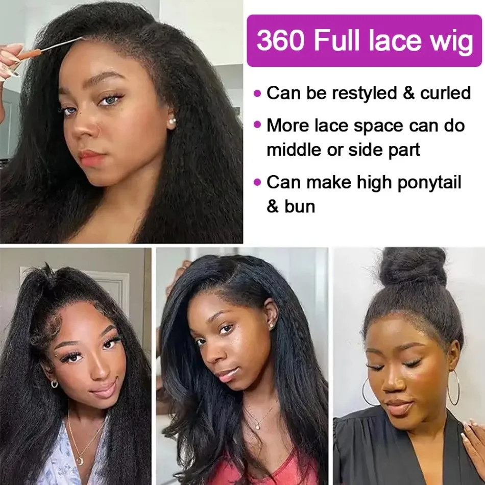 ❥360 Full Lace Front Wigs Features: 360 Kinky Straight Wig With Drawstring, Can Be Dyed, Bleached, Straightened. Cover The Entire Hd Transparent Lace With The Bleach Knot, Make The Hairstyle In Bun And High Ponytails.Show Your Charming Style.
